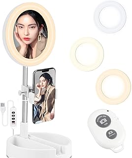 LED リングライト 6インチ USB式 鏡付き スタンド一体式 3色モード 10段階調光 折りたたみ式 コンパクト 軽い 小型 卓上ライト 撮影照明用ライト デスクライト 高輝度LED スマホグリップ付き 美容化粧/tiktok/YouTube生放送/ビデオカメラ撮影/zoom/web会議/テレワーク